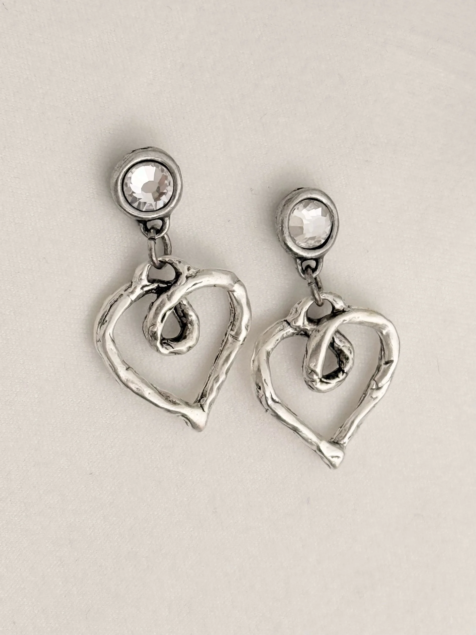 Create In Me A Clean Heart earrings Inspired by Psalm 51:10 feature a silver open-loop heart with an organic, whimsical silhouette that dangles freely from a round crystal stud. The movement of the heart brings lightness and quiet expression, while the silver finish chosen to wear softly and beautifully on every skin tone.